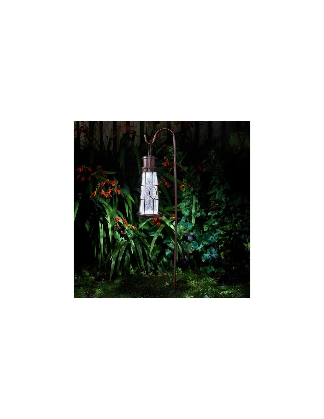 Avec sa forme originale en phare, cette lanterne suspendue fera merveille dans un parterre de fleurs et illuminera avec des motifs ses alentours.