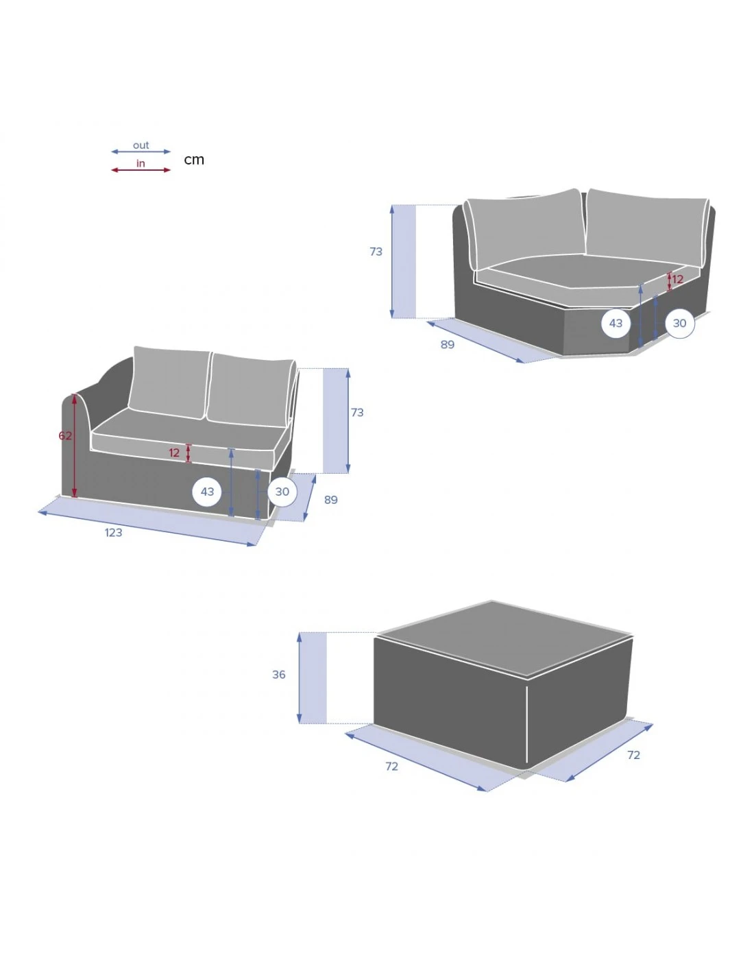 - 1 angle 113 x 113 x 73 cm