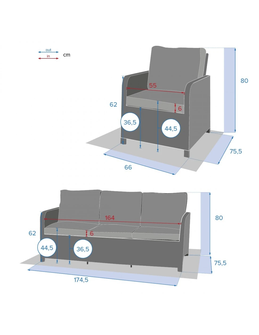 - L. 174,5 x P. 75,5 x H. 80 cm