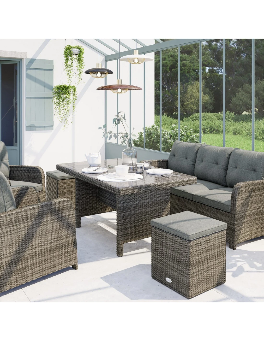 Salon de jardin en résine tressée, composé d’une banquette 3 places, 2 fauteuils, 2 poufs, une table haute, et des coussins épais !